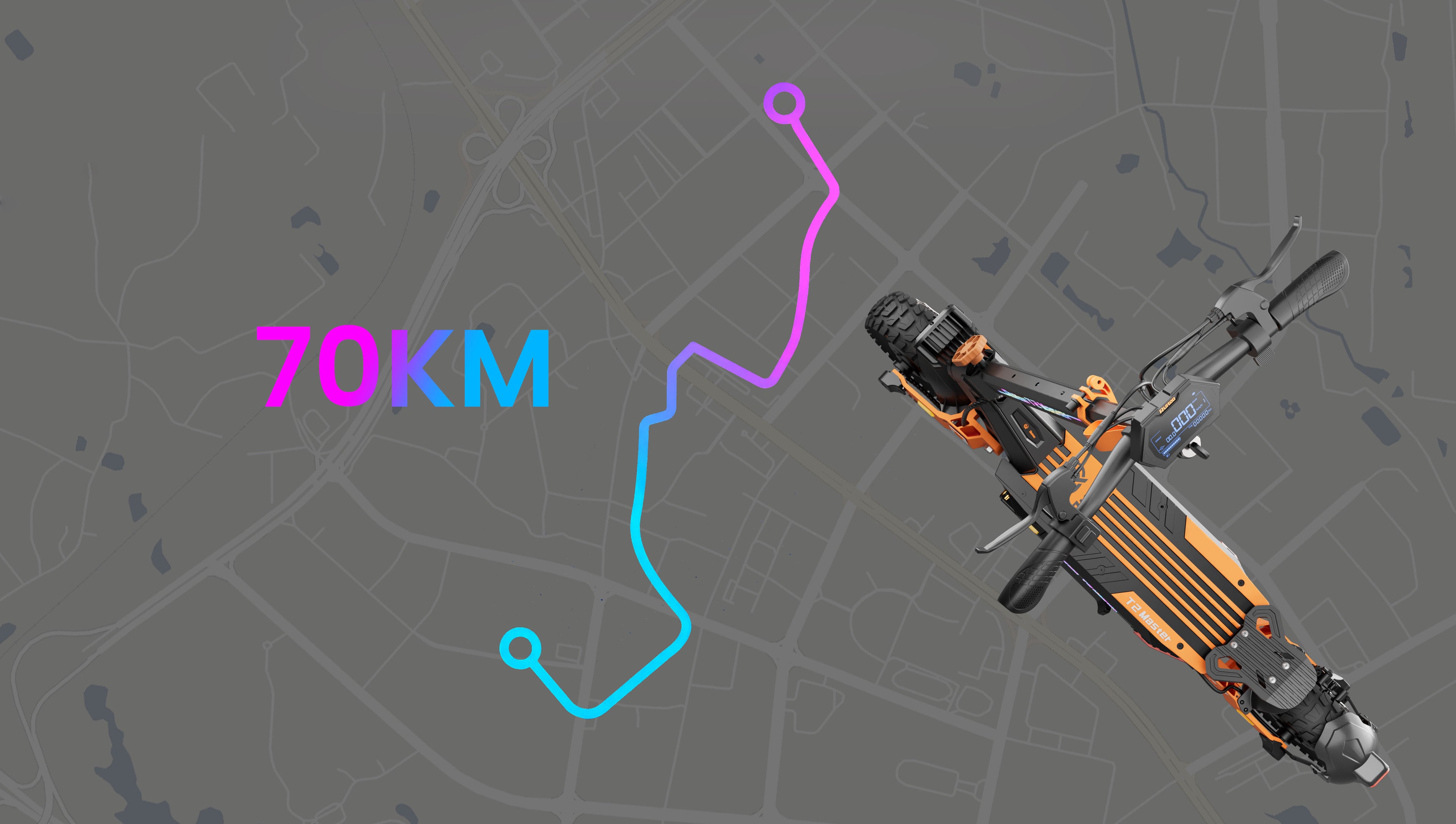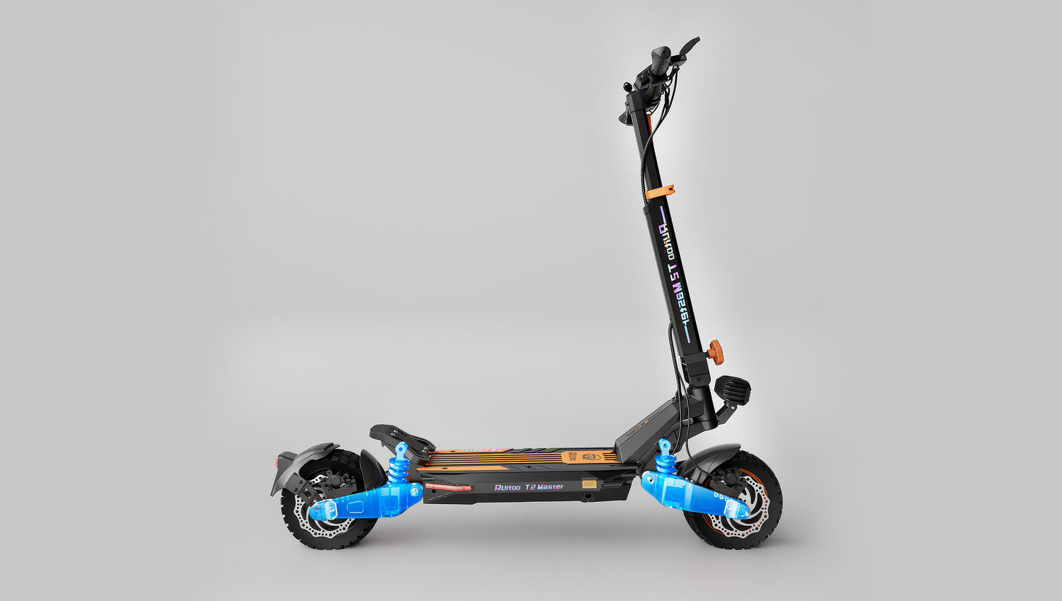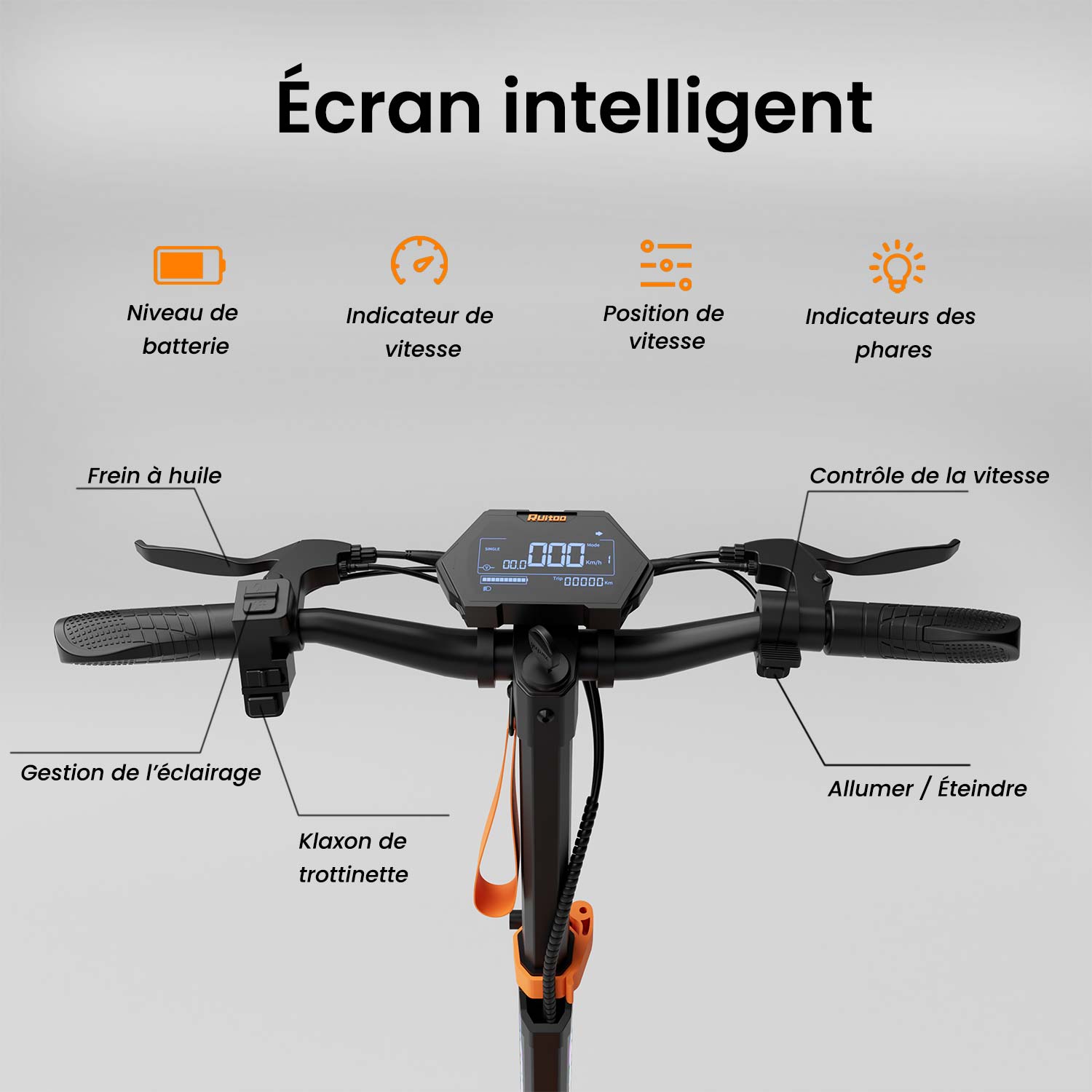 Équipée d’amortisseurs hydrauliques avant et arrière, la trottinette offre une suspension performante qui absorbe efficacement les chocs et garantit un confort optimal sur tous les terrains.