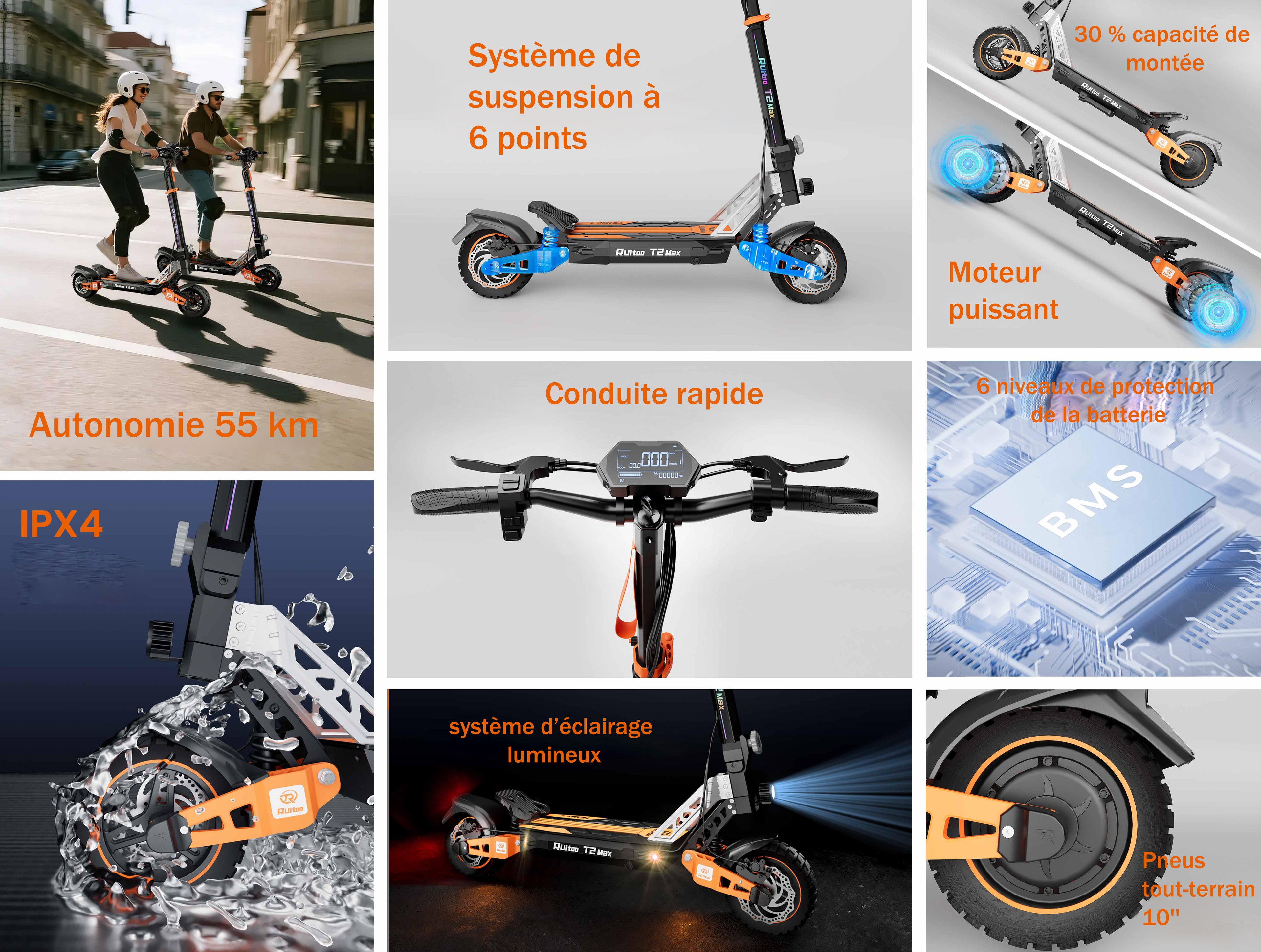 Équipée de pneus tout-terrain de 10’’, cette trottinette électrique offre une stabilité optimale et une tenue de route exceptionnelle sur tous types de surfaces.